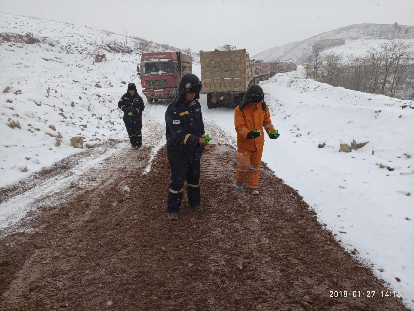 -----兗州中材禹州分公司趕工生產場記 雪花,仿佛在此迷了路,不知疲倦地,連續三天三夜,一片又一片,鋪天蓋地般伴隨著透骨的寒風,利刃似的迎面而來…… 數九寒天,持續低溫,千里冰封,萬里雪飄,整個世界好像變成了一只巨大無比的冰箱,山川冷地顫抖,路面凍地僵硬,就連空氣,似乎也要凝固起來。 安全生產大于天!已是寒冬臘月,年關將至,為了能在1月21日到2月10日為期20的天生產期限內正常供礦,滿足水泥廠順利生產的需求,禹州分公司的全體員工們正夜以繼日、廢寢忘食的堅守在生產最前線。 面對糟糕天氣帶來的種種不利生產因素,他們沒有退縮,也沒有氣餒,更沒有逃避:冰天雪地,道路本來就滑得連走路都異常謹慎、艱難,而被運輸車輛來來回回碾壓過的運礦道路更是如履薄冰!安全隱患不容小覷,及時、合理、有效的解決措施更是刻不容緩!現場管理人員迅速調動裝載機用土石鋪墊路面。 然而,剛剛鋪好的“安心”路面很快又被不停飄落的雪花覆蓋了、掩埋了,大家又立即采取了人工往運礦道路上撒鹽的辦法來融雪化冰,以達到安全生產、穩產的目的。 緊繃安全生產的琴弦,現場管理人員們時刻眼觀六路,耳聽八方,腳不停歇。白茫茫的礦山上時不時走動著這些忙碌的可愛“雪人們”,他們在認真負責地指揮挖機師傅如何合理挖裝;他們在耐心十足的警醒汽車司機放慢車速、平穩倒料、安全第一;他們再仔細檢查、巡視每一個可能出現安全紕漏的角落。 大地一片銀白,一片潔凈,夜已很深,而雪花,仍如柳絮,如鵝毛,如棉花,從無邊無際的天空中不知倦怠的飄飄灑灑,寒風怒吼著呼嘯而過,低溫仍在繼續發酵!天寒地凍里,不畏嚴寒風霜,不懼艱難險阻、勇于吃苦耐勞的禹州分公司的全體員工依舊未眠,他們正用滿腔的青春熱血和積極飽滿工作熱情來燃燒、來暖化這萬里冰山...... 兗州中材建設有限公司禹州分公司 2018年1月27日 |