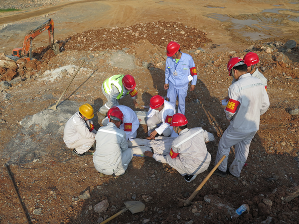 演練模擬礦山施工作業面35平臺進行爆破作業,由于炮孔充填深度不夠,導致沖孔現象,產生飛石,現場管理人員在礦區北側警戒時,被爆破飛石砸中,導致腿部受傷,傷勢嚴重。總指揮在接到救援電話后,立即啟動三級應急預案,通知辦公室、各應急小組就位。礦山應急救援隊員攜帶專業救援裝備,駕駛應急救援車,拉警報,火速趕赴事故現場。到達現場后,立即判斷受傷人員傷情,及時救出并進行止血包扎、固定等簡單處理后由救援隊員用擔架抬上120救護車,并送往就近醫院救治。演練過程中各應急小組各司其職、協同作戰、反應迅速,整個演練過程在快速、緊張、有序的氛圍中進行,圓滿完成了各項預定任務。    此次放炮應急預案演練貼近實戰、分工明確、行動迅速、救援工作有條不紊地執行。既督促企業落實安全主體責任,指導提高員工的安全隱患意識和管理能力,確保了黃槽坊礦山的整體安全,又達到了檢驗礦山應急救援小組的實戰和應對突發事件的應急處置能力的目的,更進一步檢驗了預案的可操作性和針對性,為今后突發生產安全事故下熟練完成救援任務打下了堅實的實戰基礎。