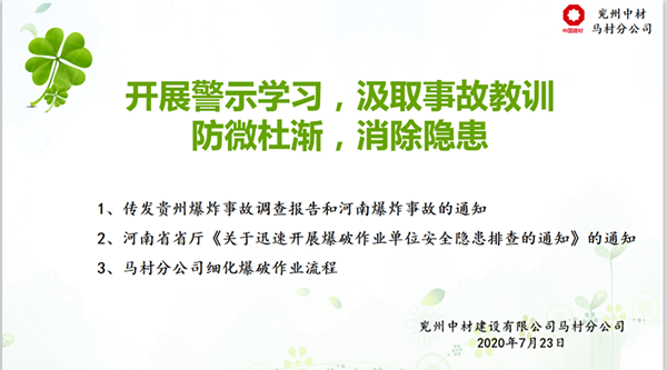 馬村分公司于723日下午在會議室舉行了“開展警示學(xué)習(xí),汲取事故教訓(xùn),牢筑安全防線”的會議,會議為大家轉(zhuǎn)發(fā)了貴州凱里市舟溪鎮(zhèn)3.19”較大爆炸事故調(diào)查報告》及河南欒川縣爆炸事故有關(guān)情況、河南省省廳《關(guān)于迅速開展爆破作業(yè)單位安全隱患排查的通知》。同時為了認真貫徹“安全第一、預(yù)防為主”的方針,切實做好現(xiàn)場安全爆破作業(yè),并規(guī)范管理使用民用爆炸物品的工作,從根本上消除爆破安全隱患,杜絕爆破事故的發(fā)生,實現(xiàn)安全生產(chǎn),馬村分公司參會人員學(xué)習(xí)爆破作業(yè)安全規(guī)程的相關(guān)知識。