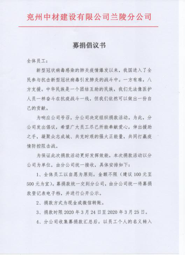 陽春三月,乍暖還寒。全國疫情防控工作取得重大勝果接近尾聲之際,仍有很多人士奮斗在抗疫第一線。災(zāi)害無情,人間有愛,近日來,蘭陵分公司積極響應(yīng)公司號召,組織開展為防控新冠肺炎疫情捐款活動,助力新冠肺炎疫情防控工作。   蘭陵分公司下發(fā)了《募捐倡議書》,堅持自覺自愿與量力而行的原則,呼吁全體員工積極參與,奉獻愛心,捐款助力抗擊疫情。分公司經(jīng)理龔士朋同志帶頭捐款,以實際行動做表率,起到很好的模范作用。在龔經(jīng)理的帶動下,分公司全體員工積極響應(yīng),紛紛捐款,每一名員工都獻出一份愛心。  經(jīng)過幾日的募捐,蘭陵分公司共籌集善款8000余元。3月25日,分公司安環(huán)科長孟令民同志,代表分公司將所籌善款轉(zhuǎn)交蘭陵縣紅十字會。紅十字會工作人員表示會將善款上交省紅十字會,全部用于新冠病毒疫情防控工作。并對捐款表示十分感謝,對此崇高的人道主義精神和奉獻愛心的善舉,表示誠摯的敬意。最后頒發(fā)給捐贈者榮譽證書。 涓涓細流匯成浩浩江河,點點善舉集成大愛無疆!病毒無情人有情。疫情阻擋不了我們前進的步伐,只要我們同心協(xié)力,希望的種子總有一天會生根發(fā)芽,讓我們一起向沒有疾病的春天出發(fā),一起攜手打贏這場疫情防控阻擊戰(zhàn)! |