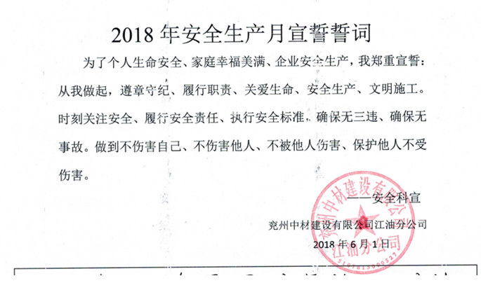 會上,安全科傳達《2018年安全生產月活動實施方案》并對安全工作進行闡述與部署。組織員工觀看安全教育宣傳片,通過對典型真實案例的生動再現,使員工真正從思想深處懂得安全,重視安全,時時刻刻想著安全,增強職工安全意識,強化安全理念,提高職工的安全素質。項目副經理強調,安全是社會經濟發展的需要,是企業自身發展的需要,是從業人員參與勞動的需要。要樹立“紅線意識”,堅決落實崗位責任;加強安全教育宣傳,定期排查隱患,完善安全體制建設,依法治安、依法作業;堅持“安全第一、預防為主、綜合治理”的方針,持續有效推動公司安全生產形勢穩定發展。項目經理要求,一是要加強領導、高度重視,正確把握當前安全形勢,突出落實安全責任主線,深刻認識開展“安全生產月”活動的重要意義;二是要圍繞主題、協調推進,大力宣傳黨和國家的安全生產方針政策、法律法規,通過開展一系列安全活動,進一步營造“關愛生命、關注安全”的安全氛圍;三是要扎實開展、狠抓落實,以“安全生產月”活動為契機,在保持雙體系有效運行的同時做到統一思想、提高安全意識,為公司安全穩定、和諧發展提供有力保障;四是要強化培訓、提升意識,圍繞國家法律法規,開展員工安全教育培訓,全面提升全員綜合安全素質及法制意識,強化依法治企、依規治企。會議最后,項目部組織全體員工進行安全月宣誓和簽名,安全生產月正式拉開帷幕。