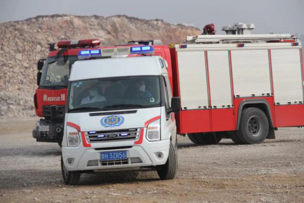 本次演練模擬柴山礦+147平臺開采作業時,采面發生坍塌,致使3名作業人員遇困,情況十分危急,急需救援。事故發生后,企業立即啟動應急救援預案,組織自救,并迅速上報曲阜市相關部門,請求救援。曲阜市政府迅速將事故情況報告濟寧市相關部門和市政府,濟寧市政府根據事故情況,立即啟動《濟寧市非煤礦山較大生產安全事故應急預案》,柴山礦及地方政府進行聯合處置,實施救援,事故現場得到成功處置。