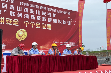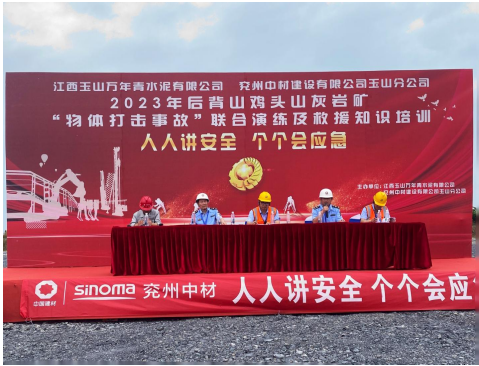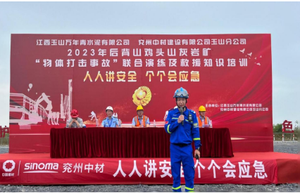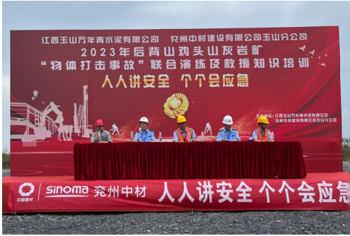 為深入宣貫黨的二十大精神和習近平總書記關于安全生產重要論述,進一步樹牢“以人為本、安全發展”的安全生產管理理念,貫徹“安全第一、預防為主、綜合治理”的安全生產方針,強化非煤礦山事故應急救援管理工作和應急救援隊伍建設,切實提高分公司應對礦山突發事故的聯合應急救援綜合能力,6月17日,兗州中材玉山分公司聯合江西玉山萬年青水泥有限公司、玉山縣藍天救援隊、玉山縣人民醫院等舉辦2023年“物體打擊事故”聯合演練及救援知識培訓活動。玉山縣應急管理局局長吳高峰、玉山萬年青水泥有限公司總經理李躍華等出席本次活動并致辭。