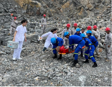 演練開始,總指揮張鵬收到現場有發生塊石滾落,造成現場技術員腿部受傷請求救援的緊急報告,立即下達指令啟動分公司應急預案,并對本次救援進行全面組織部署,對分公司警戒保衛組、搶先救援組、醫療救護組、通訊聯絡組等下達指令,各小組在接到指令后立即響應應急預案,第一時間到達事故發生地,按秩序組織搶險救援,對傷員進行緊急救治并對事故發生地進行警戒隔離。
